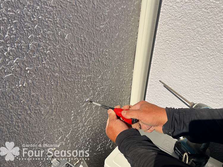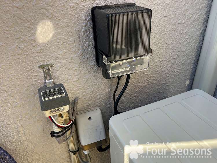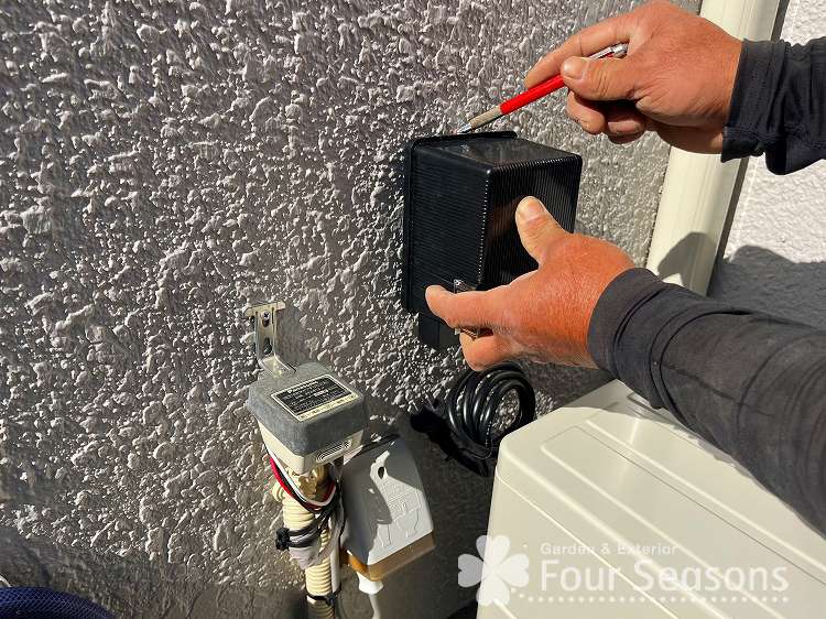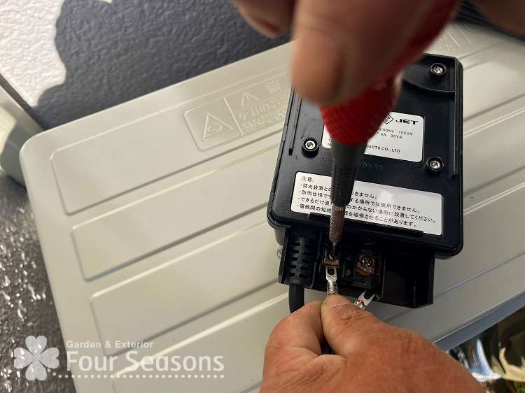 まずは 外部コンセントがあるところに トランスと呼ばれる変圧器(100Vから12Vに変換する装置)をとりつけていきます