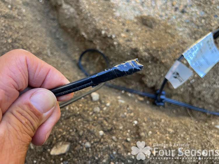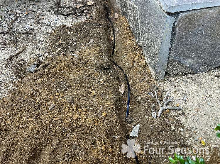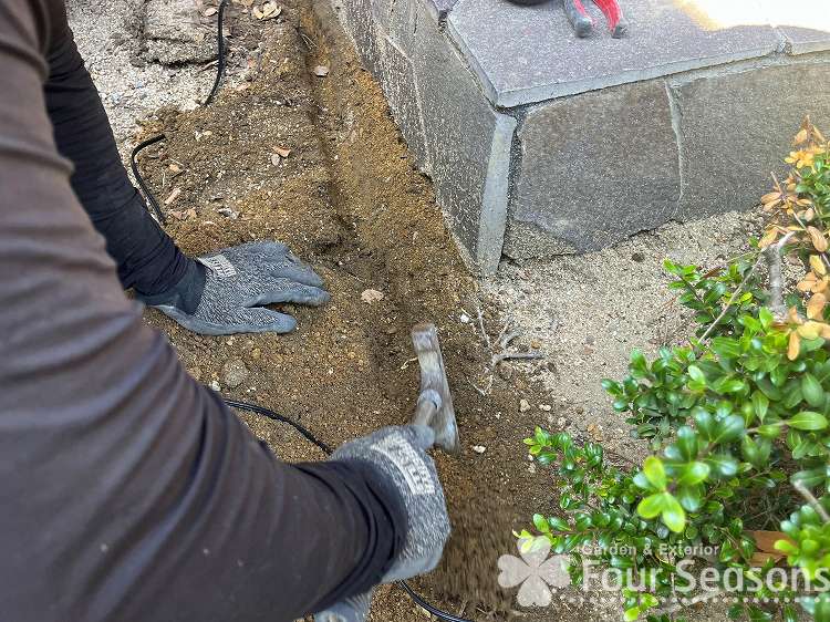 次はコードを埋設していきます。掘れる道具ならなんでもいいですが スコップが好ましいです