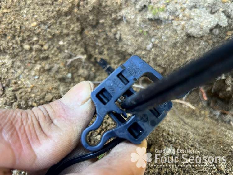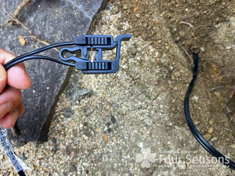 次に灯具からでているコードについている接続端子をコードにはさみこみます 針が両サイドからでているので 針がコードに突き刺さり導通するようになります