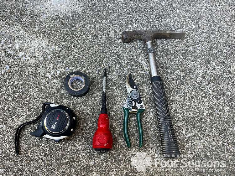 今回使ったのは ドライバーとはさみとハンマー(スコップが好ましいです)とメジャー、絶縁テープです