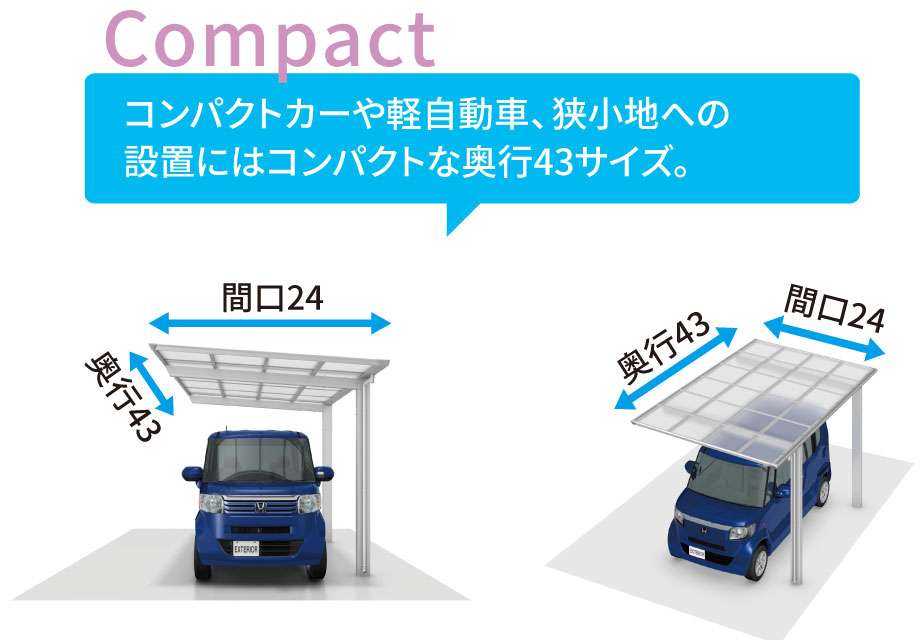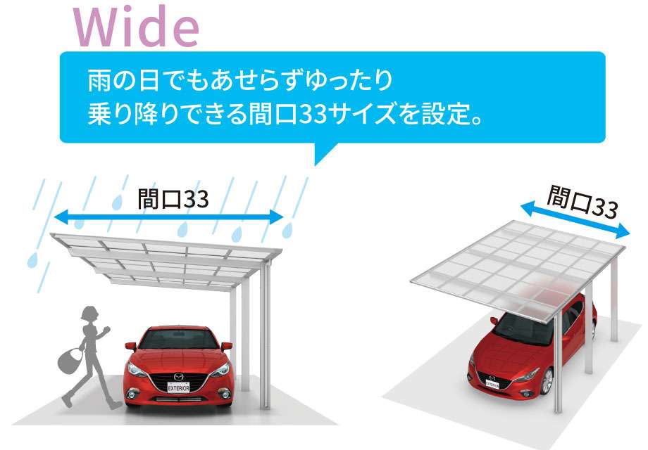 当社:1台駐車用カーポートでは最大の間口3354mmを設定。