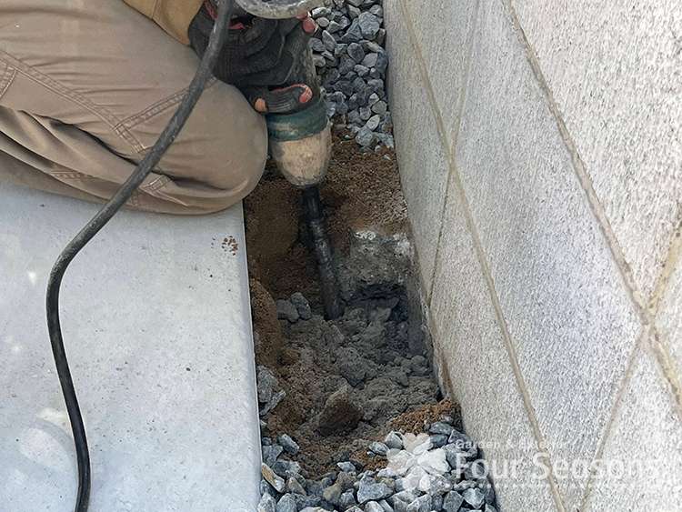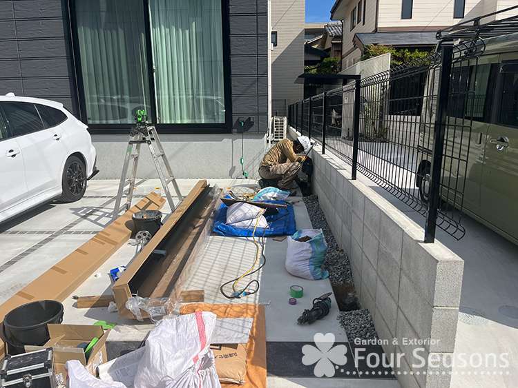 取付は境界塀の横のコンクリート舗装がされていないところに柱を建てるのですが、ブロック塀には基礎がありますので、表面が土と言っても地中にはコンクリート基礎が必ずあります。ですから それを最小限壊して柱を建てていきます。