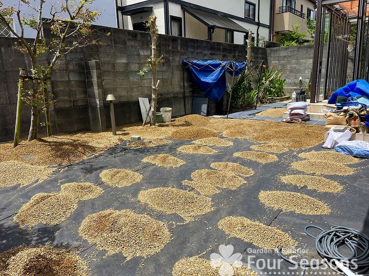 中庭 の敷き詰めた様子です 防草シートを敷き詰めたおかげで 中々雑草は生えてこないでしょう。チリ埃が詰まって種子が飛んできて発芽してもすぐに抜くことができます