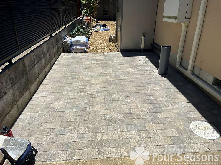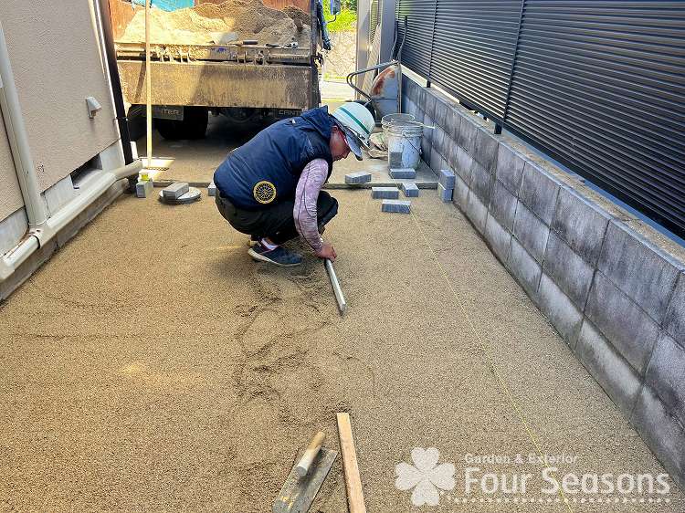 駐車場の後ろは もともと パーキングブロックという芝生を保護するためのプラスチック製の敷材を敷いていましたが、車を駐車していると どうしても芝生の部分が枯れてしまうため 今回は インターロッキングという よく歩道に敷かれている舗装材をしきました。舗装の下はサンドクッション工法といって砂を用いてその上に舗石を敷きて行きます