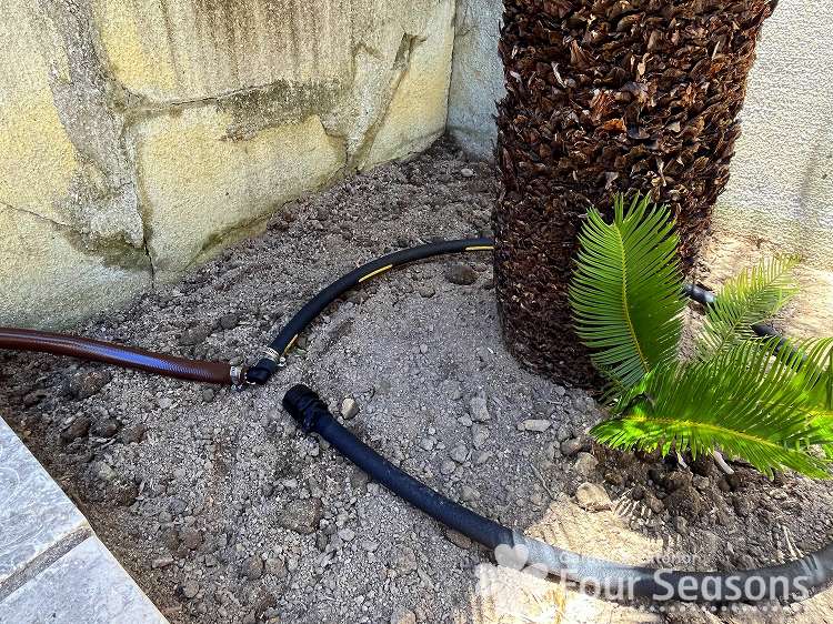 今回はドリップ型のホースを用いて植えたてのソテツのまわりに設置しています