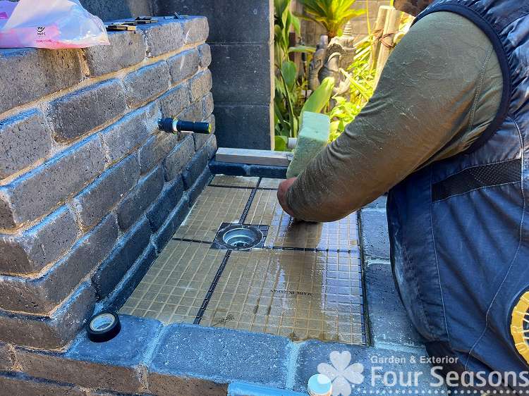ガーデンシンクもモザイクタイルを張って仕上げていきます。