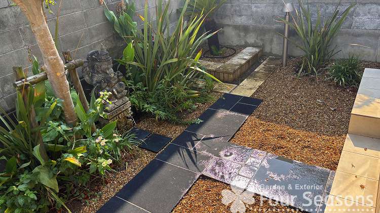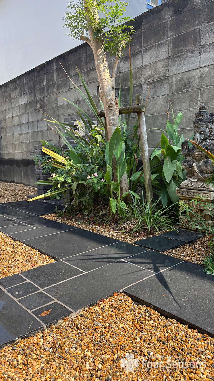 今回は 中庭のリガーデンをおこないました。 アジアンテイストで 黒の素材を多く使いました。 中庭は広いので手間を省くように今回はしています。できるだけコストを抑えて見栄え良くつくることを考えています