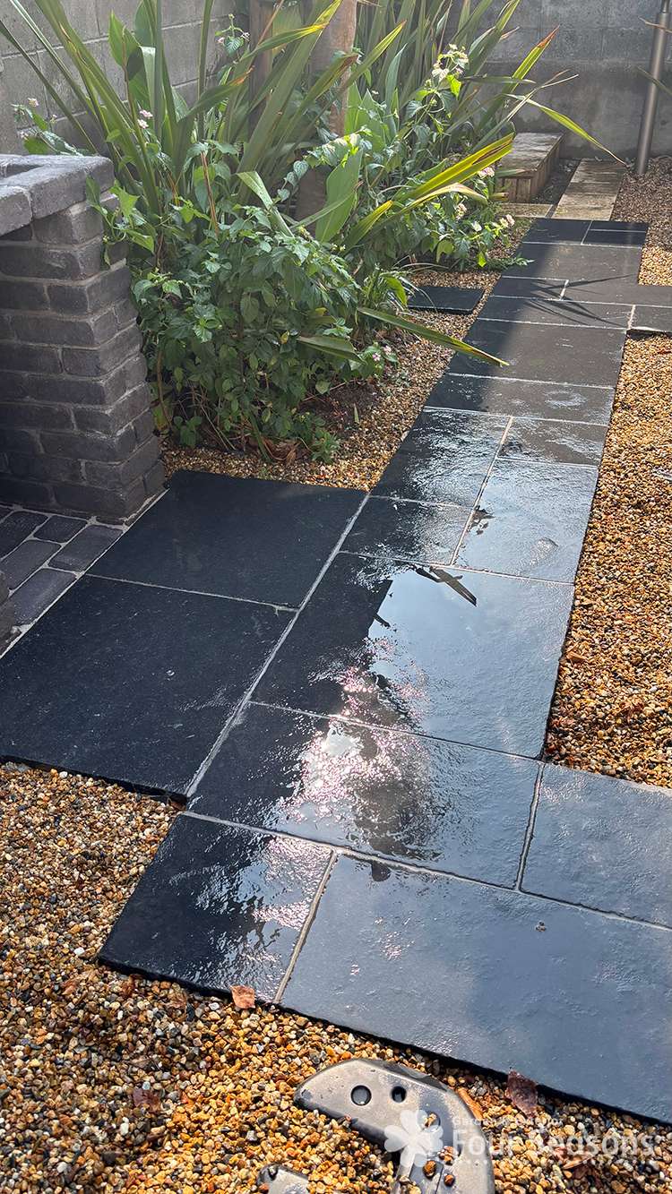 アプローチ尾様子です。方形張りの黒の石のアプローチの様子です。導線方向に石を張ってみました