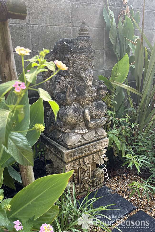 以前バリで買った石像がいい味をだしています シンクにも家から敷石を敷き詰めています