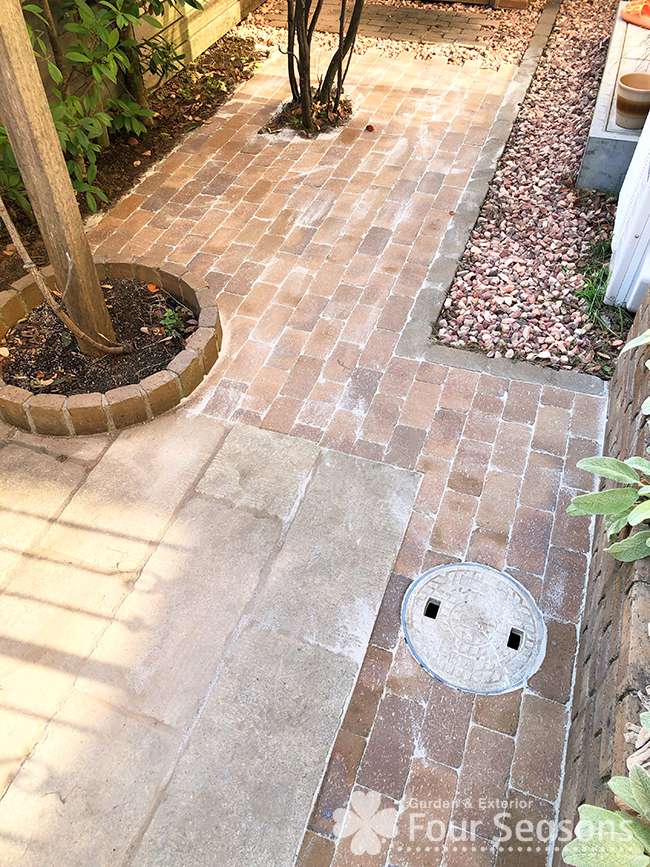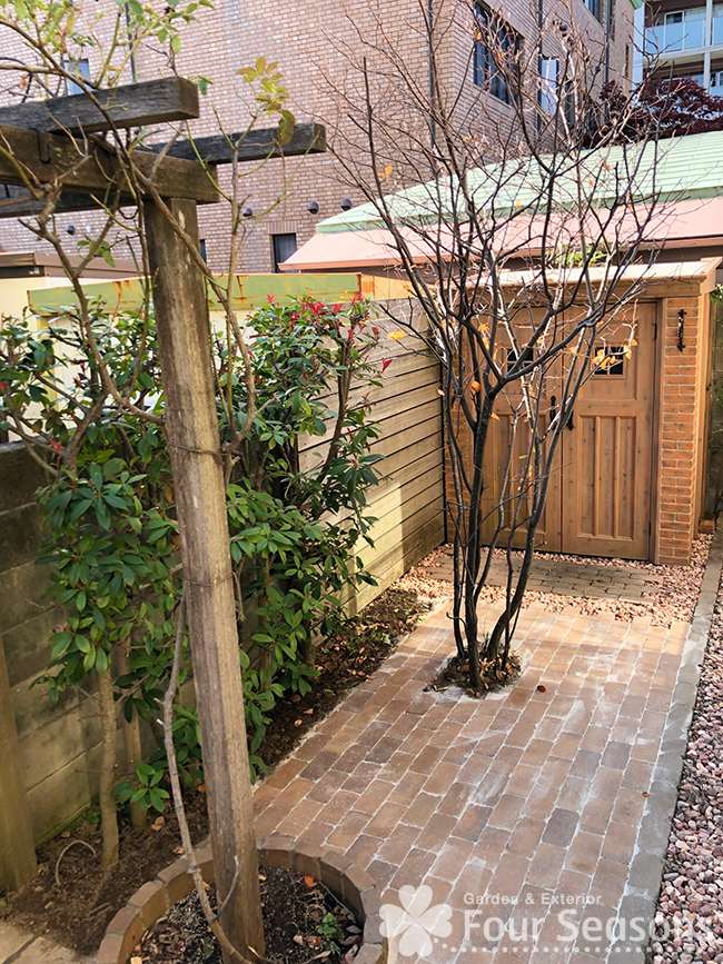 ご自分でお手入れがしにくい部分の芝生をレンガ敷きに変えた