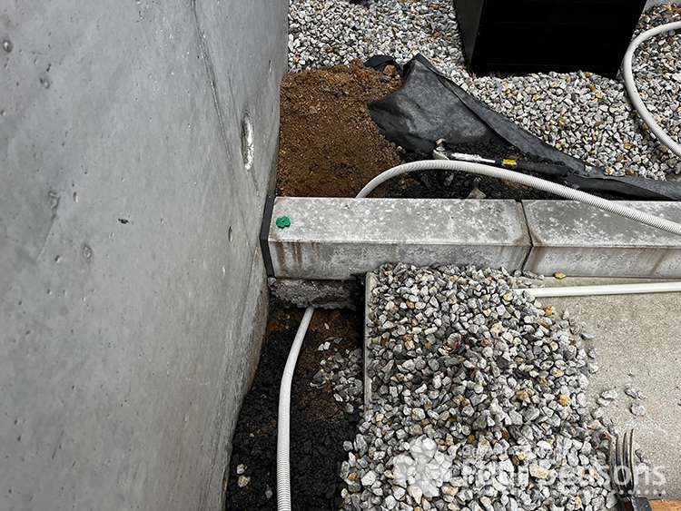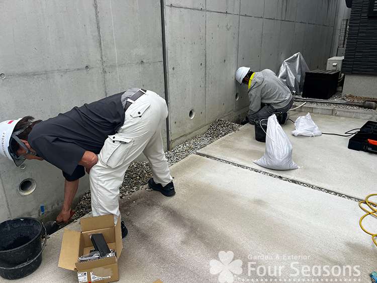 今回は照明をつけるため、配線を地中配管で導線していきます。今回は写真のような縁石があったので、その基礎よりは深く掘っていき配管を埋めていきました