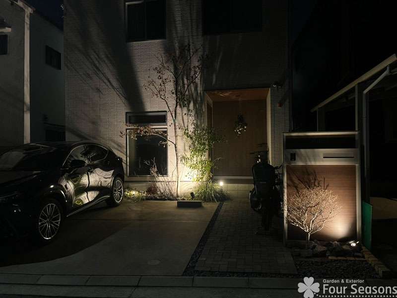 植栽と門柱を一緒に照らすことで、エントランス全体の印象がぐっと引き締まりました。